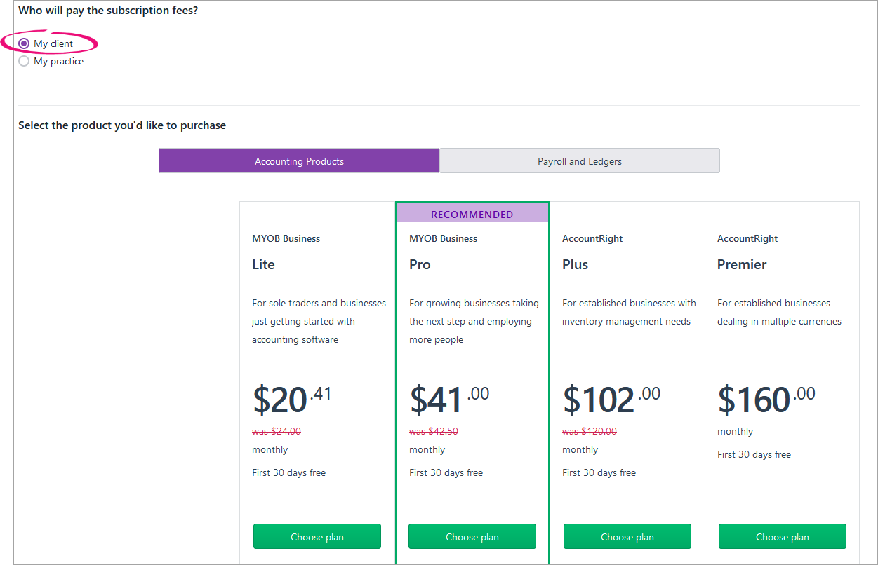 Next time you create an online file, you'll be able to choose if your practice or client will pay for the subscription. If you choose My Client – the cost of the software you refer to your client will show the relevant discount based on your Partner Program tier.