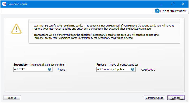 Before continuing, check that you’ve selected the correct cards to be combined. If you combine the wrong cards, you will have to restore them from a backup and re-enter transactions posted to those cards since the backup.