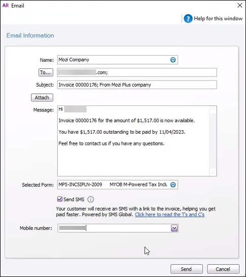 SMS is only available when you email an online invoice payments-enabled invoice using AccountRight's email service. It's not available when you email invoices via Microsoft Outlook.