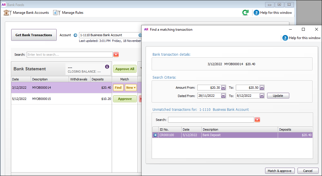 If you prefer to manually match bank feed transactions, or you notice that there isn't an automatic match, you can click Find to find the bank deposit and manually match it: