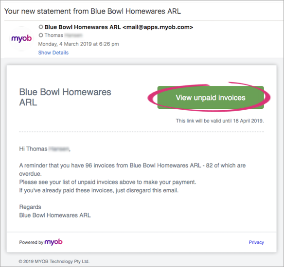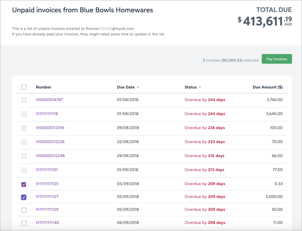 If you send customers emails from AccountRight, they can pay multiple invoices in one go through their list of unpaid invoices. All they need to do is select the invoices they wish to pay and click the Pay invoices button below.