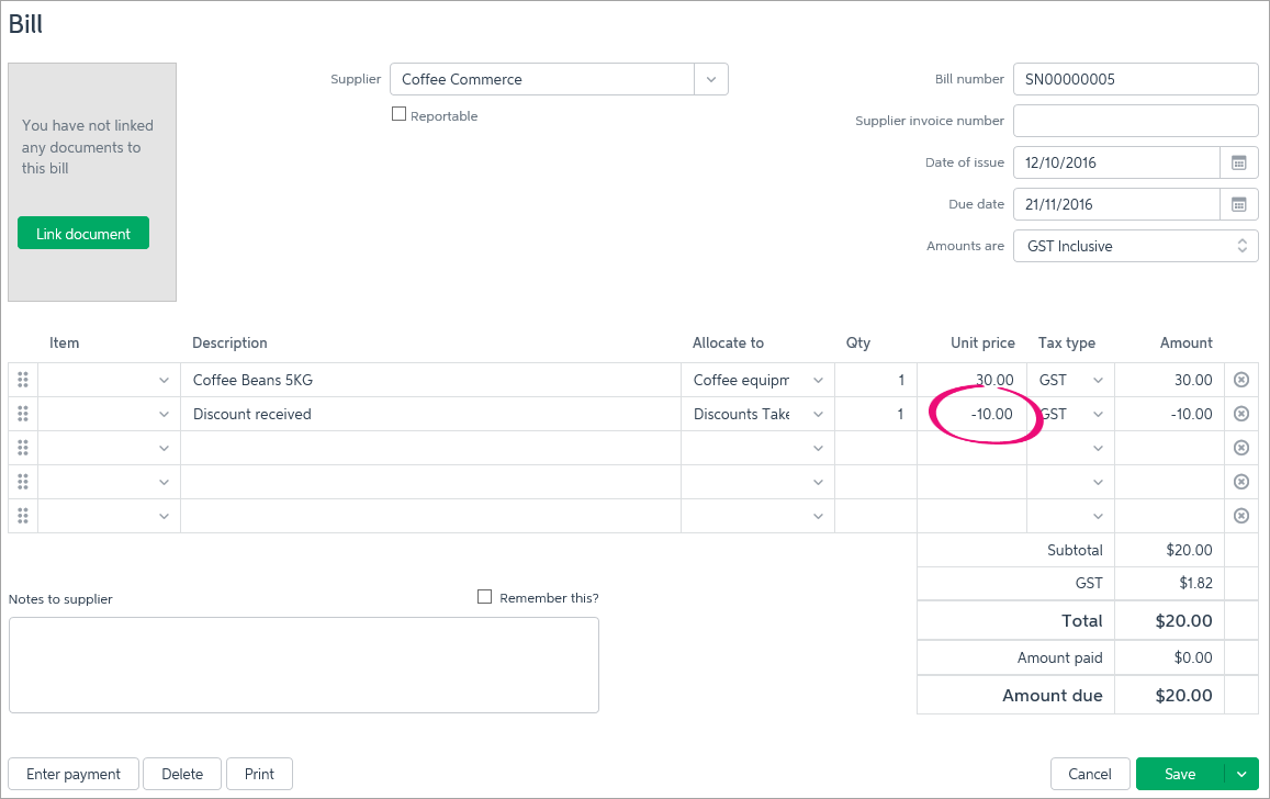 If you regularly enter a specific discount on bills, such as $10 off, you can create an item (similar to a stock item) to represent the discount. You can then add this item to a bill.