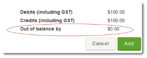 Note: To add more lines, click Add another line. - When you have finished entering all the line items, check the total Debits and Credits displayed at the bottom left of the panel. If the amounts are not equal, there will be an amount in the Out of balance by field.
