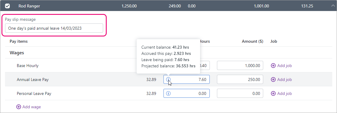 icon in the leave hours field to see the employee's leave balance details. - (Optional) Use the Pay slip message field in the employee's pay to enter their leave dates. Here's our example showing 7.6 hours annual leave added to the pay with leave balance details shown.