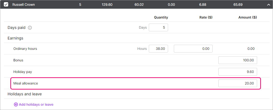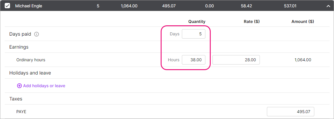 - At the Calculate pays step of the pay run, click the employee to expand their pay.