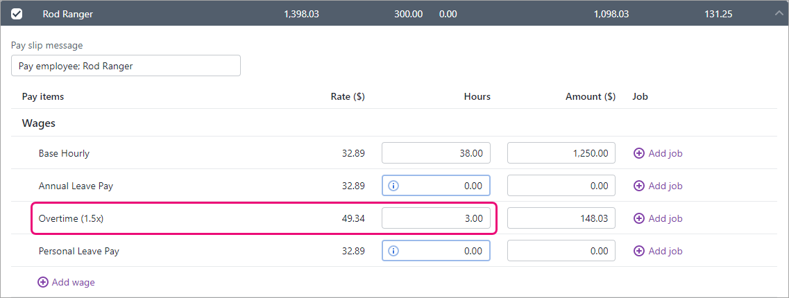 - If the pay item you want to record hours or amounts against isn't listed, click Add wage to add it to this pay run.