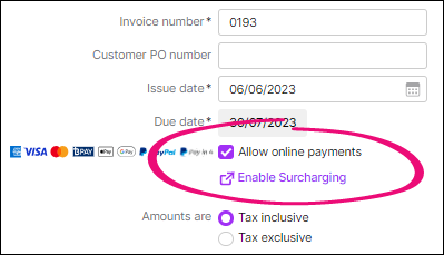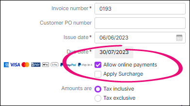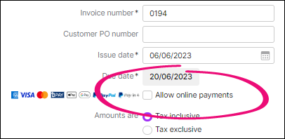You can select whether to enable online invoice payments for each individual invoice by selecting the Online payments option.