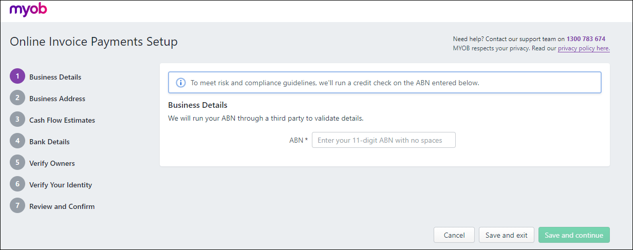 Business Details – enter details like your ABN, business name and industry. This is to help confirm and protect the information provided.
