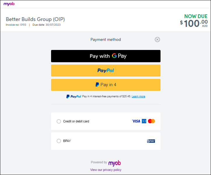 When a customer makes an online payment, it'll automatically be recorded in your MYOB business, and the associated invoice will be closed off. You'll receive an email notification about the payment – the payee also receives an email confirming that they've paid.