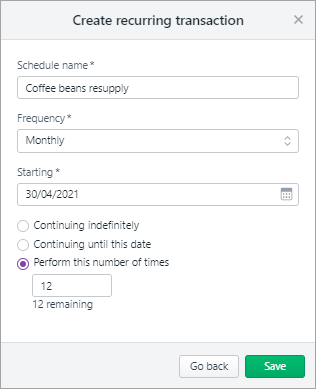 - If you haven't already done so, create the first recurring transaction, following the steps in 'Create a recurring transaction' above.