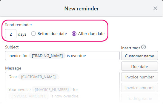 When changing or adding a reminder, choose how many days before or after your invoice due date to send the reminder.