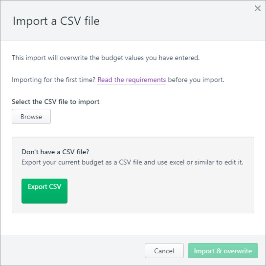 - Click Import & overwrite. Your CSV file is imported into your budget.