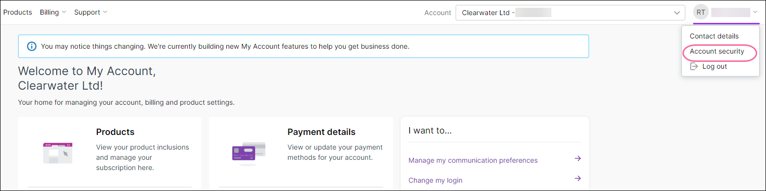- Click Account security from the drop-down menu under your name (in the top right of My Account) to open the Account security page.