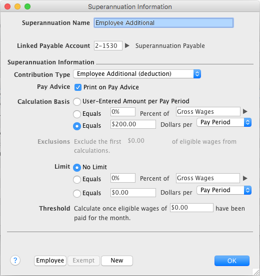 For example, for an Employee Additional superannuation deduction of $30 per pay period and a limit of 2% of gross wages, a pay with gross wages of $1000 yields superannuation of only $20 (i.e. 2%).