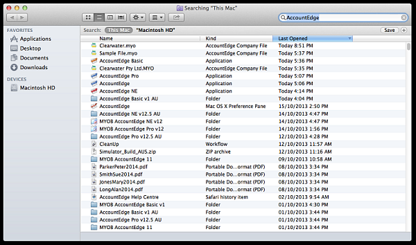 For example, in all of the above results, AccountEdge Network Edition files were not part of the results. This is because Network Edition files are in the Library folder of the host computer, e.g. Macintosh HD/Library/Application Support/AccountEdge NE/Databases