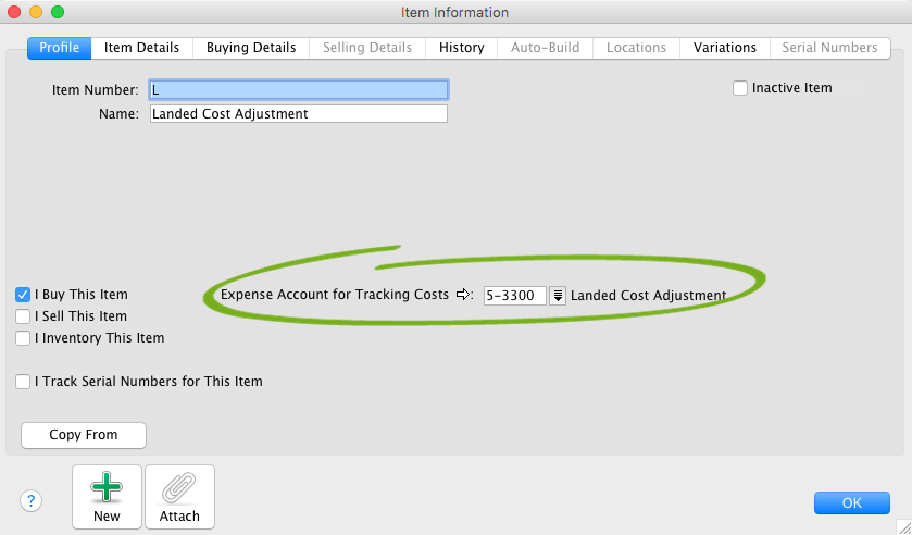 First, make sure you've set up the inventory items which you'll be importing (Inventory > Items List > New). Then, create an inventory item to use for tracking landed costs when recording an overseas purchase.
