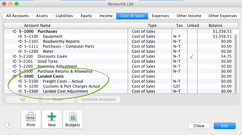 You'll need to create Cost of Sales accounts to track each landed cost (Accounts > Accounts List > Cost of Sales tab > New). It's a good idea to organise these accounts under a header account called Landed Costs to help keep your accounts list organised.