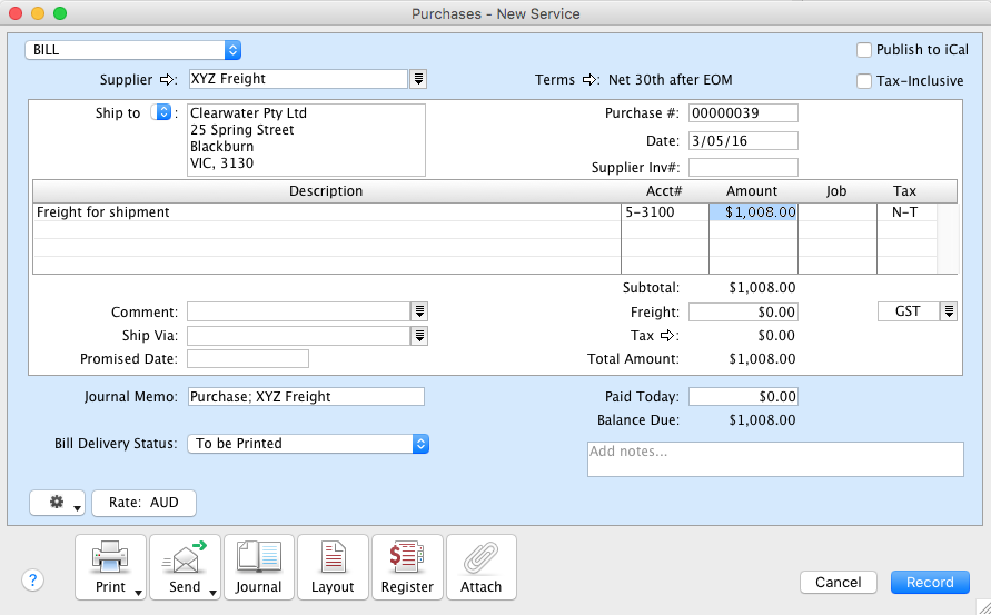 Now that you've calculated your landed costs and AccountEdge has been set up, you're ready to enter a purchase for the imported items at full landed cost (Purchases > Enter Purchases).
