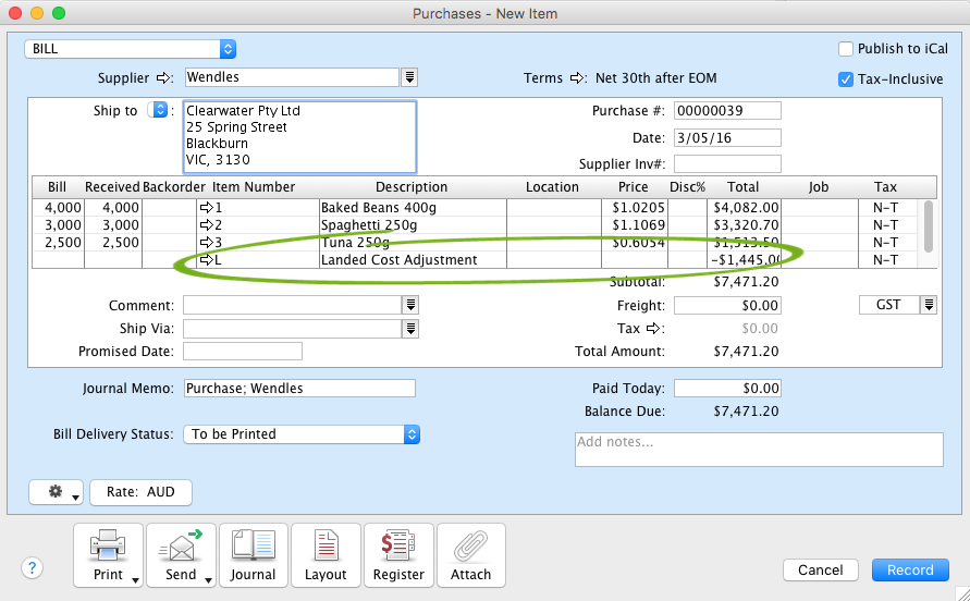 - enter the Total of the landed costs as a negative value. This ensures the landed costs are not included in the total purchase price.