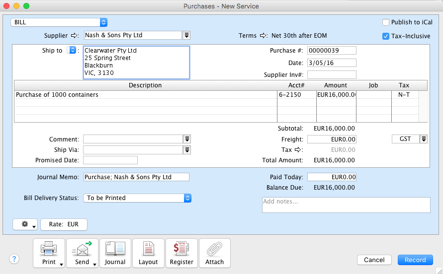 Record the purchase as normal (Purchases > Enter Purchases). Referring back to our example, we're buying from Nash & Sons Pty Ltd to the value of EUR 16000.