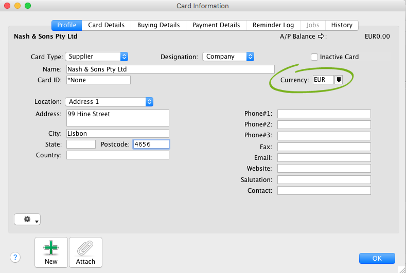 The currency used by a supplier can be set on their card. This means when a purchase is recorded for that supplier the applicable currency will automatically be used.