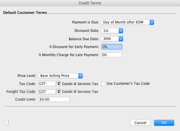 - Click the Terms button. Set up the default terms as shown in the example below: