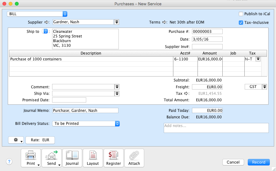 Referring back to our Nash Gardner example, the sales/purchases entered in our company file would be: