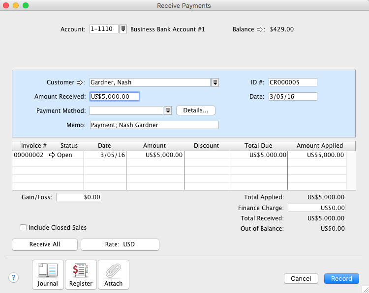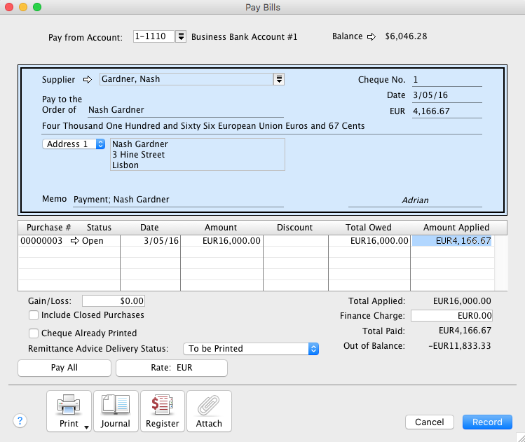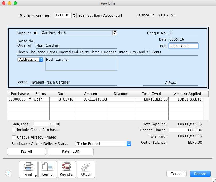 The window below shows the final payment made to Nash. This needs to be entered using Pay Bills and applied to the open bill. Similarly, Nash would use Receive Payments.