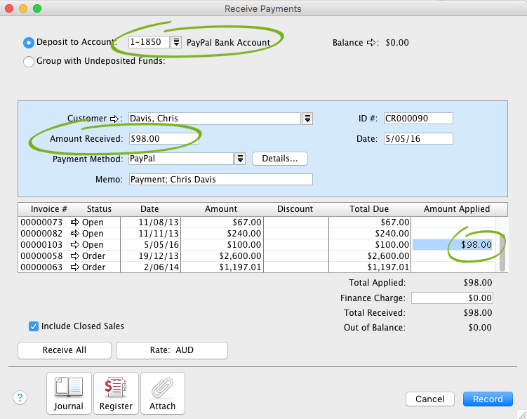 In our example, a $100 sale is received through PayPal, from which $2 is paid to PayPal, resulting in a net sale of $98. You will need to record both transactions in AccountEdge: a customer receipt of $98 and a merchant charge of $2.