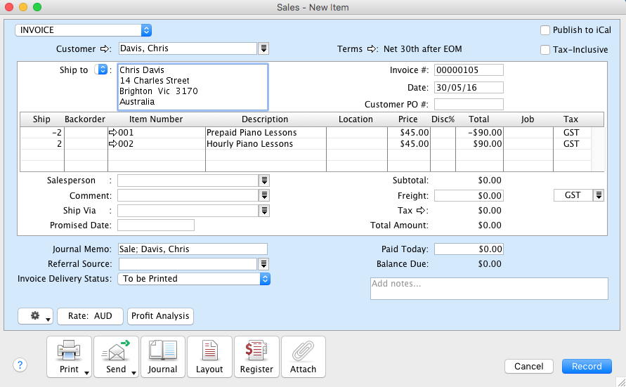 In this example, we will assume a business sells piano lessons in hourly blocks, and students need to pay for 5 hours in advance. The business has set up an item named Pre-paid Lessons (hours) to record the pre-payment.