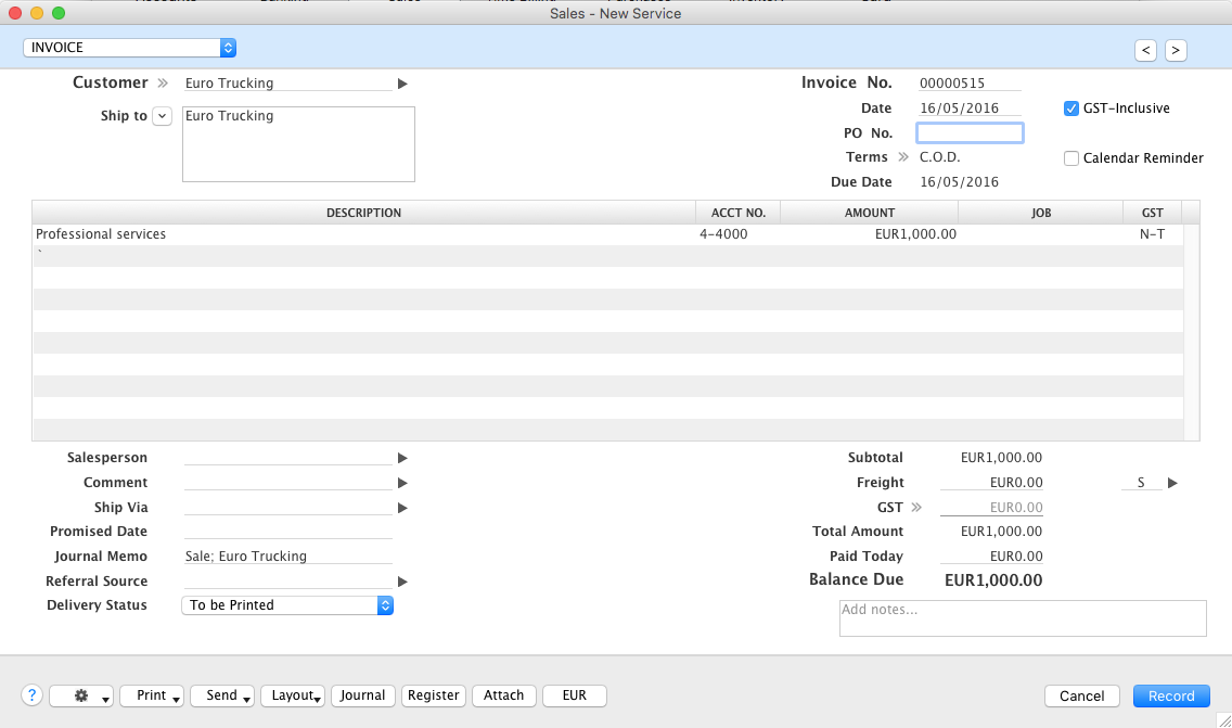 In the following example, your company (Clearwater Pty Ltd) invoices its first ever European customer for professional services. You invoice Euro Trucking 1000.00 EURO for your attendance at a conference as a guest speaker. At the time you issue the invoice, the exchange rate is 1.704739.