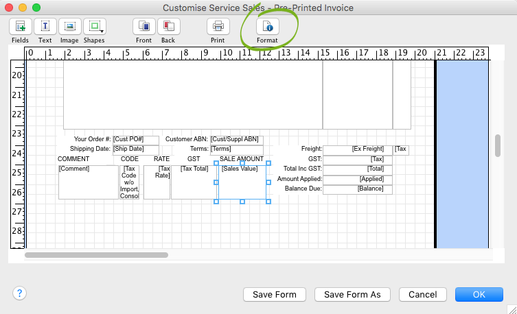 When customising invoices or statements you need to make sure the box that encloses a field is large enough to fit the size font you have chosen. This is accomplished in two ways: