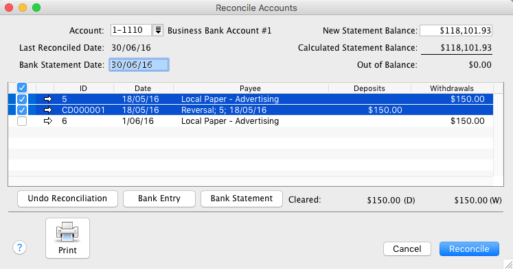 The example Reconcile Accounts window shown below has both the stale/stopped cheque and the reversal selected as Cleared. It also includes the reissued payment which is yet to be presented to the bank and is not selected as Cleared.