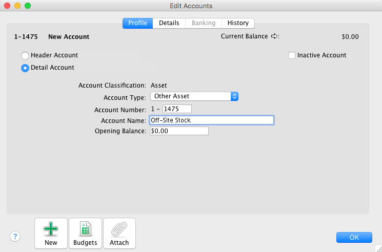 - Enter an applicable Account Name, such as Off-site Stock.