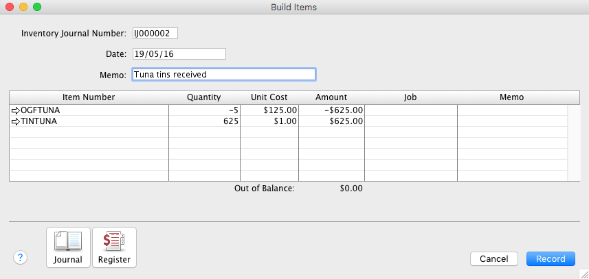 - Record a Build Items transaction (Inventory > Build Items).