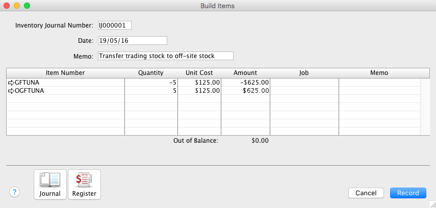 - Record a Build Items transaction (Inventory > Build Items) to move stock from trading stock to off-site stock.