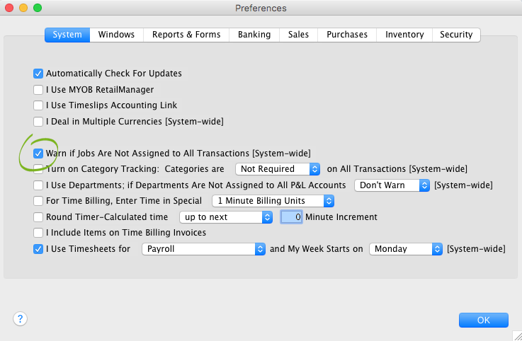• As shown below, there is a software preference (go to the Setup menu and choose Preferences) which will ensure a warning is displayed for all transactions if a Job has not been specified.