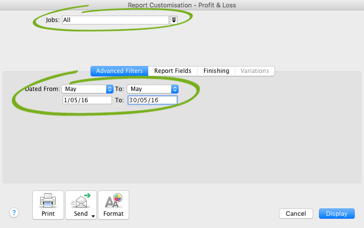 At the end of the reporting period, a Profit and Loss report can be generated for all jobs. Note that in BusinessBasics the report customisation window and associated fields will be slightly different.