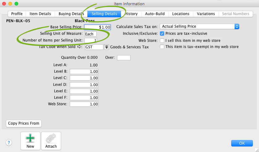 If you're unsure as to the best way to set up quantities per unit, you always have the option of simply setting them up in a one-to-one relationship. In other words there is always a quantity of 1 per selling unit. This enables you to simply enter the total number of units you have received or sold on transactions.