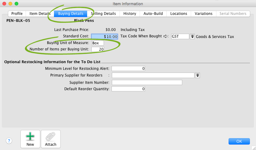 It is important to note that in this scenario when you enter a bill for this item and enter a quantity of 1 in the Bill column, 20 pens are going in to stock. If a quantity of 20 is accidentally entered thinking that 20 pens are being ordered, the result is that 400 pens will go into stock.