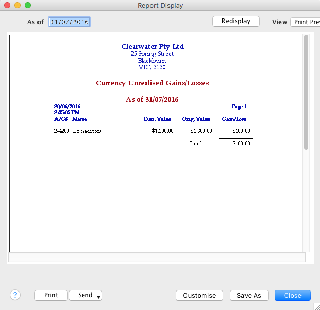 AccountEdge includes the Unrealised Gain/Loss report to help you easily determine these values. Prior to running this report you need to update the exchange rate, otherwise the report will calculate the gain or loss based on an incorrect exchange rate.