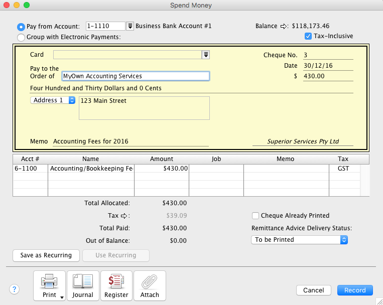 The window below shows account number 1-1110 Business Bank Account selected for an example Spend Money transaction.
