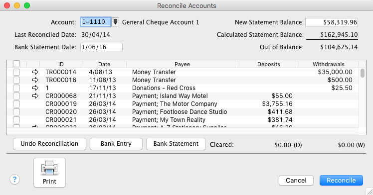 Bank and credit card accounts are easily reconciled by using the Reconcile Accounts function.