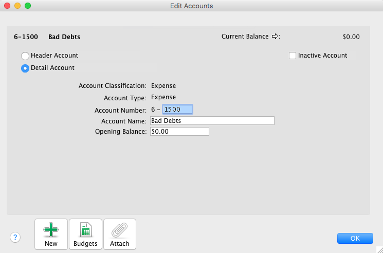 - Name the account 'Bad Debts' (if creating an Expense account) or 'Provision for Bad Debts' (if creating an Asset account).