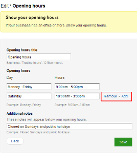 - If your opening hours vary each day, use the Add link to add more Day and Hours fields.