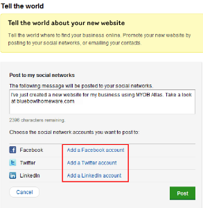 If you have Facebook, Twitter or LinkedIn accounts, you can link them to your MYOB Atlas website. By linking your social network accounts, you can: