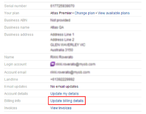 In the Billing info section of the My account page, click Update billing details. You'll be redirected to my.MYOB, where you'll complete the process.