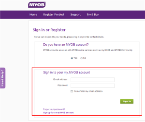Enter your MYOB Account details and log into my.MYOB (if you're already logged in, you won't see this window). For more information about MYOB Accounts and my.MYOB, see About MYOB Accounts and my.MYOB.