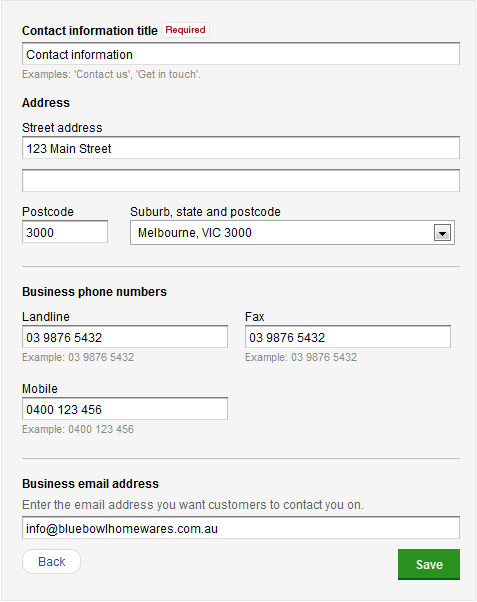 Contact information title: the default title for the section is 'Contact information', but you can edit it to suit your business (for example, 'Contact us' or 'Get in touch').