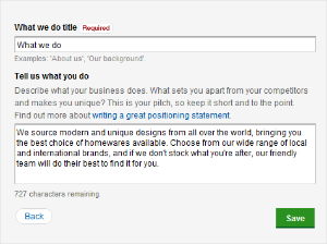 In the Tell us what you do field, describe what your business does. What sets you apart from your competitors and makes you unique? This is your pitch, so keep it short and to the point. For more information, see Writing a great positioning statement.